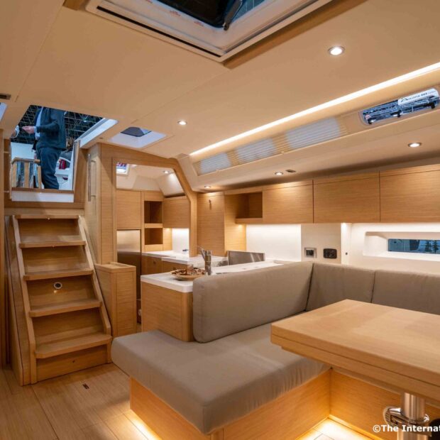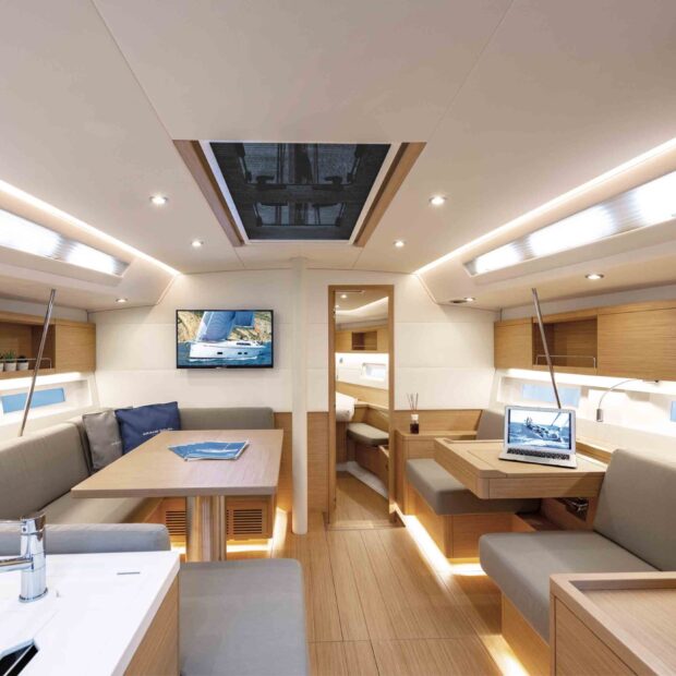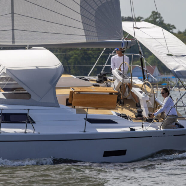 Like the rest of the Long Cruise range, the Grand Soleil 42 Long Cruise is designed to offer unparalleled comfort and luxury on board, providing an extraordinary yachting experience. The Grand Soleil 42 Long Cruise is available in either two – or three – cabin layout. All lines are led to the helmsman’s station, with two winches on each side (electric as an option) within easy reach of the helm. Maneuvering is also simplified by the furling mainsail in the mast (opt) and the self-tacking jib (std). The optional carbon arch, when present, frees the large cockpit from clutter and supports the dodger and bimini.