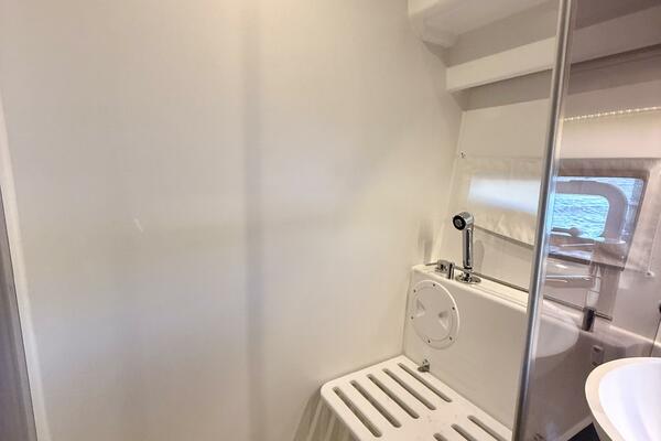 To port is a large head with a separated shower area and an opening porthole for ventilation.