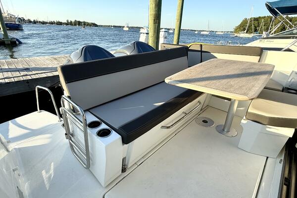 Modular cockpit: A large U-shaped cockpit lounge comfortably fits a large group and easily converts into a spacious sunpad. The transom platforms are on both sides of the outboard engines, making boarding safe and easy.