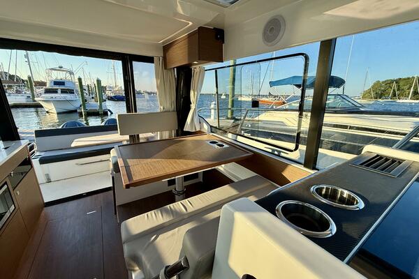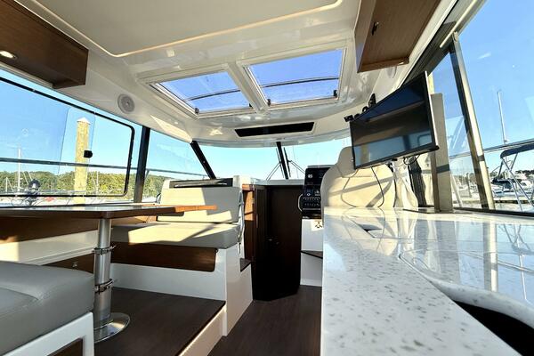 Versatile Seating: Inside the salon, there is a dinette to port. The copilot seat can tilt forward and back, allowing for the seat to be used when dining. The entire seating area and table converts into an additional berth as well.