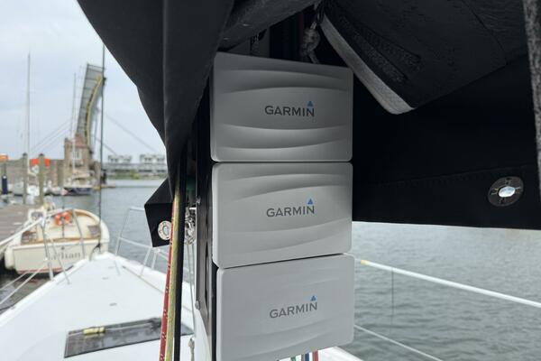 For electronics, The Rocc has a B&G Hercules 5000 processor with 2x Triton2 displays above the companionway, and 2x at the helm. The mast bracket has 3x Garmin GNX large-format displays. She has a B&G plotter at the NavDesk, with a connection for a laptop to run other routing / navigation software. She has a B&G VHF with a secondary cordless and AIS (send & receive).