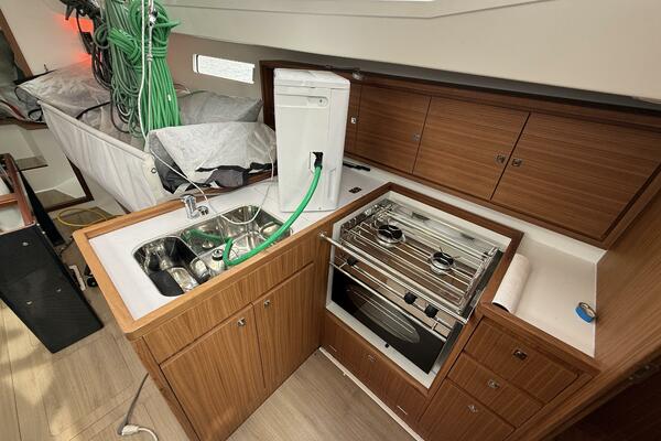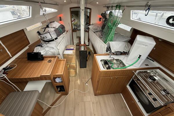 Below deck you will find a custom carbon table - satisfying ORC requirements. Her original table also transacts with the boat. She is equipped with deep (custom) lee cloths for berths in the main salon. Her V-berth and starboard quarter berth are unchanged but offer spacious accommodations. Her L-shaped galley to starboard, has a gimbaled 2-burner gas stove and oven, a double stainless-steel sink, and top load refrigerator, with ample storage for dry goods.